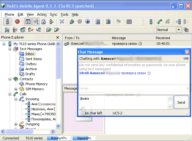 2. Text messages. Позволяет отправлять и принимать SMS сообщения прямо на компьютер (телефон, разумеется, должен быть подключен к компьютеру). Можно вести архив сообщений, обмениваться сообщениями в режиме чата и создавать шаблоны.