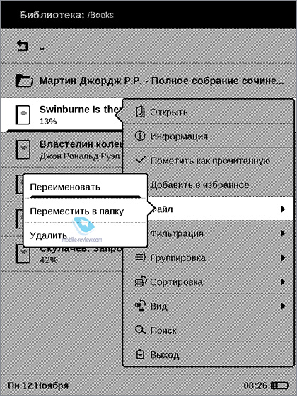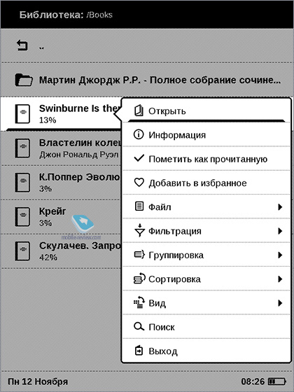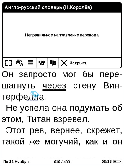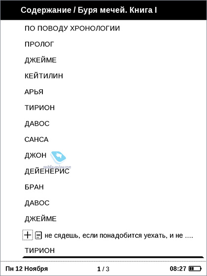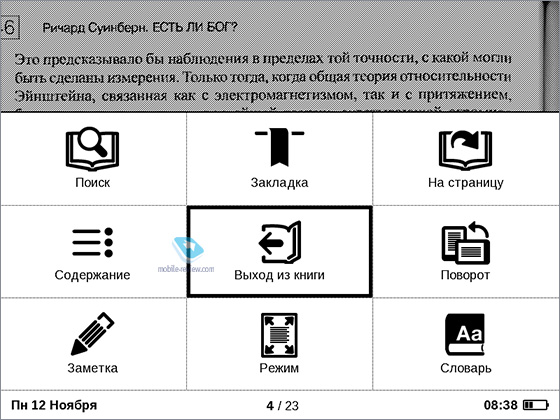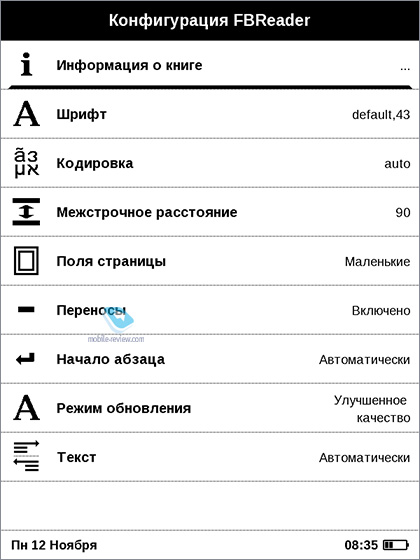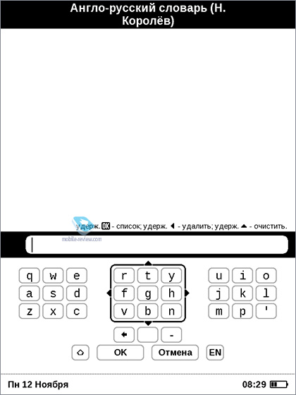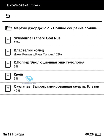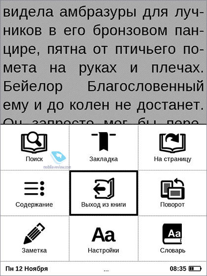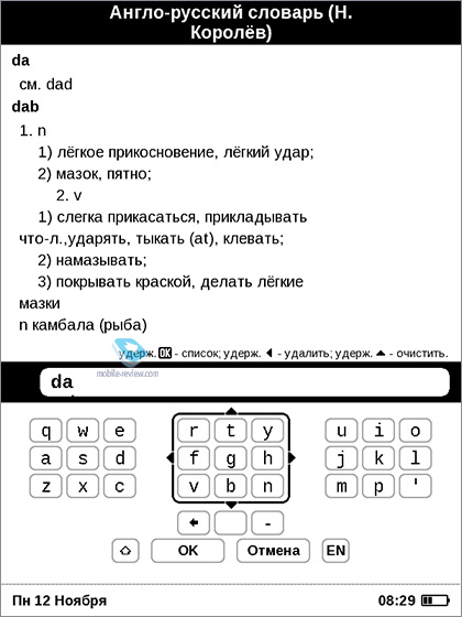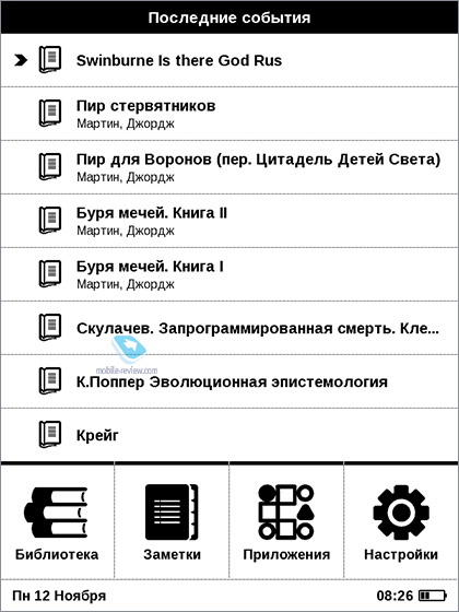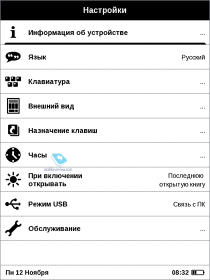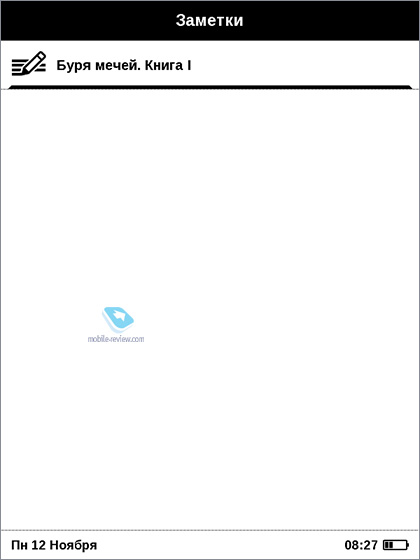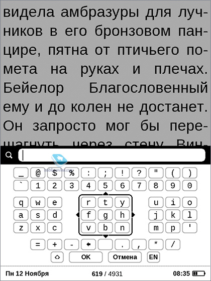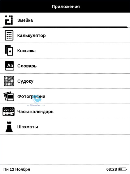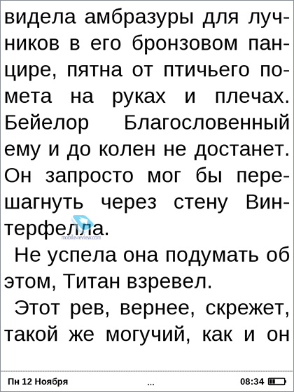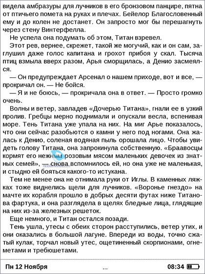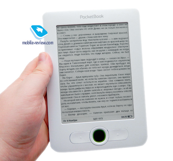 ![]() ![]() ![]() ЭкранВ модели используется 6” E-Ink экран с разрешением 800х600 точек, выполненный по технологии Vizplex. Как и во всех книгах, использующих электронные чернила, дисплей Basic New отлично подойдет для чтения при любом свете, с него удобно читать даже в солнечную погоду. ![]() Что касается качества экрана, то здесь двоякая ситуация. С одной стороны, перед нами качественный экран, с которого удобно читать при использовании больших и средних шрифтов. Но с другой стороны, конкуренты в этом ценовом сегменте (4 500-5 000 рублей) уже оснащены Pearl HD экранами с разрешением 1024х768 точек. При чтении с использованием мелкого шрифта Basic New проигрывает этим конкурентам. Удивительно, что при использовании устаревшего экрана в PocketBook смогли добиться такой высокой скорости отклика. ![]() Лично у меня чтение с Basic New не вызывало дискомфорта, правда, я использую шрифты среднего размера. Производительность и памятьВ книжке установлен процессор с частотой 800 МГц и 128 МБ оперативной памяти. Ёмкость внутреннего накопителя — 2 ГБ, есть слот для карт памяти, поддерживаются карточки объёмом до 32 ГБ, мою карточку такого объёма книга отлично распознала. На деле же Basic New работает очень быстро. Это одна из самых быстрых книг из всех, которыми я пользовался. Первое время я просто листал страницы вперед-назад, удивляясь скорости читалки, честно говоря, я не ожидал, что книги на электронных чернилах могут работать так быстро. Автономная работаВ модели установлен литий-полимерный аккумулятор ёмкостью 1000 мАч. Время зарядки — около двух часов. Производитель заявляет до 8000 перелистываний от одного заряда. Я прочел с Basic New около 1500 страниц текста, за это время устройство разрядилось только на одно деление, поэтому можно предположить, что заявленные производителем цифры недалеки от истины. Отдельно я бы отметил стабильность работы. У тех же Digma и Ritmix иногда весь заряд «съедается» во сне из-за какого-то процесса. В читалках PocketBook такой проблемы нет. ОболочкаВ PocketBook подчеркивали, что инженеры попытались сделать оболочку максимально простой и понятной, и, на мой взгляд, им это удалось. Начальный экран поделен на две части. Верхняя часть занимает 2/3 экрана. Тут отображаются последние открытые книги, а также информация о новых добавленных книгах. Нижняя часть занята четырьмя иконками — библиотека, заметки, приложения и настройки. ![]() Библиотека фактически представляет собой файловый менеджер, из которого вы можете быстро открыть нужную вам книгу. Отдельного каталогизирования по авторам, жанрам или названиям нет, оно и к лучшему, неискушенный пользователь мог бы запутаться в этих сортировках. ![]() ![]() ![]() В заметках находятся все сохраненные вами кусочки текста. При их открытии вы видите содержание книги с отметками, в какой главе сделана заметка. ![]() ![]() Приложения. Тут вы можете видеть 8 приложений и игр. ![]() Словарь. Словари являются серьезным преимуществом читалок PocketBook, и Basic New не стала исключением. Казалось бы, как словарь может быть удобным, если в книге нет сенсорного экрана или клавиш для ввода текста? Но PocketBook в очередной раз удалось удивить меня. В приложении используются виртуальная клавиатура и перевод в режиме реального времени, то есть после ввода слова вам не нужно будет специально идти к кнопке «Ок». Сама виртуальная клавиатура поделена на три части, благодаря этому максимальн