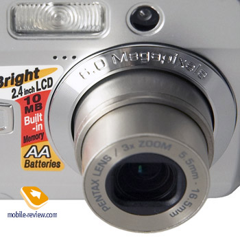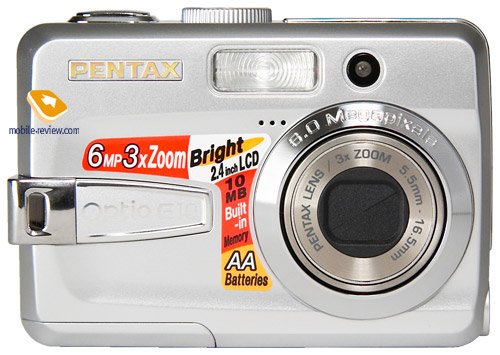 А вот как выглядит список основных конкурентов: Sony CyberShot DSC-S500, Samsung Digimax S600, Olympus Camedia FE-140. Сразу оговорюсь, что на первый взгляд надежды на какие-то выдающиеся результаты у данной камеры весьма туманные. Тест в первую очередь полезен в плане расширения кругозора, для того чтобы уяснить расстановку сил на этом рынке и положение Pentax на нем. К тому же, у каждой компании есть свои хорошие задумки. Например, сильной стороной аппаратуры Pentax всегда была эргономика. Осталась ли верна компания традиции, и какие подвижки произошли в области обработки изображений – мы сейчас и узнаем. Внешний вид и эргономикаЕсли поставить в ряд несколько компактных фотокамер от различных производителей, то E10 среди них будет четко выделяться. Есть в нем какая-то изюминка. Чувствуется, что над внешностью поработали с умом. Если говорить народным языком, то выглядит она дороже своей номинальной стоимости.