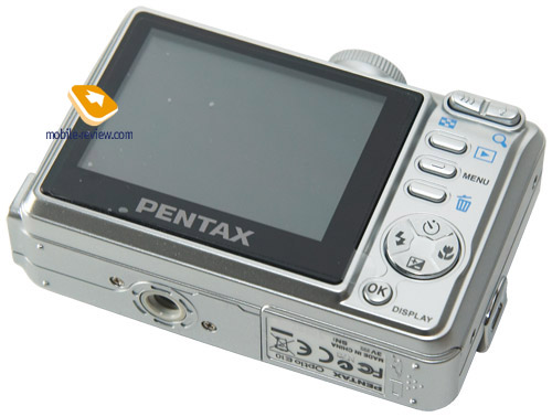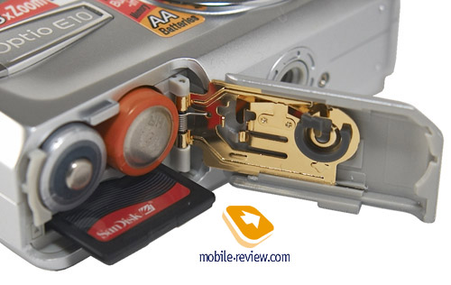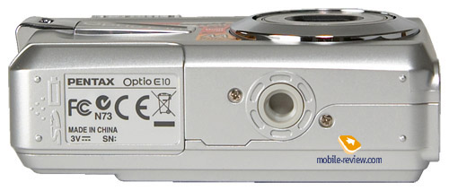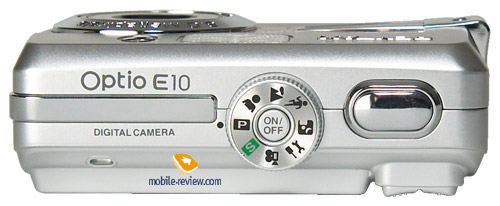 На передней панели – объектив, вспышка, индикатор автоспуска, поначалу принятый за лампу подсветки автофокуса (о нем мы еще поговорим). Накладка с надписью Optio E10 довольно органично вписывается в общий дизайн. Как ее продолжение смотрится петля для кистевого ремешка. Одновременно эта конструкция способствует более надежной фиксации фотоаппарата в руке. Странно, но факт: нигде на оправе объектива вы не найдете сведений о его светосиле. Хотя практически все делают эту маркировку.