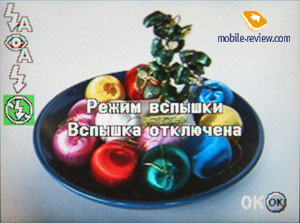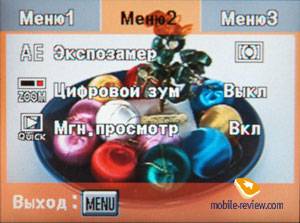 Меню настроек камеры и съемочное меню разделены. Вход в первое осуществляется выбором соответствующего пункта на колесе режимов, для вызова второго (чаще используется) есть специальная кнопка. Во время съемки можно выбрать один из четырех режимов отображения информации на дисплее: полный, краткий, отображение отключено и, что самое удивительное, экран выключен. Если быть совсем точным, то выключается подсветка. Но на суть это мало влияет. Все равно изображение практически не читается. Это при том, что дополнительного видоискателя нет. Очевидно, производитель полагает, что существуют случаи, когда есть необходимость снимать вслепую. С другой стороны, его можно приспособить для экономии энергии, чтобы каждый раз не включать/выключать питание камеры. Значки, отображающиеся при съемке, хорошо видны, но при этом не мешают кадрированию. Такой сумятицы, как, к примеру, у некоторых камер Sony, здесь нет. При обращении в режиме съемки к функциям, которые переключаются на джойстике (вспышка, режим фокусировки, экспокоррекция и режим кадров), на экране всплывает отдельное меню, после того как выбор завершен, камера возвращается в ранее установленный режим отображения информации.