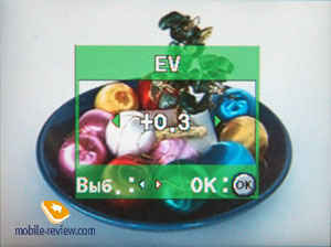Оперативна и наглядна система внесения экспокоррекции. Доступ к ней осуществляется нажатием джойстика вниз. Далее стрелками </> устанавливается требуемое значение. Диапазон составляет ± 2 EV с шагом 1/3 ступени.