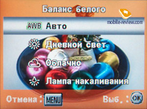 Баланс белого (ББ) ограничен пятью режимами: авторежим, дневной свет, лампа накаливания, люминесцентное освещение, облачно. Очевидно, что это позиция производителя: не включать в камеру бюджетного уровня возможность установки ББ по белому полю.