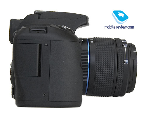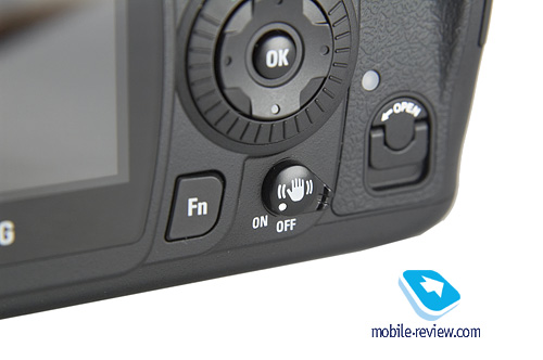 Четырёхпозиционный селектор используется для навигации по меню и выбора точки фокусировки. Обрамляющее его кольцо в свою очередь определяет режим работы фокусировочных датчиков. Их всего три: автоматический выбор точки фокусировки, ручной (SEL) и активная центральная точка. Надо отметить, что селектор немного туговат, а своеобразная насечка на нём не обеспечивает надёжного сцепления, поэтому для того чтобы научиться оперативно его вращать, придётся немного попрактиковаться. Несколько смягчает этот недостаток тот факт, что пользоваться этим переключателем приходится крайне редко. Режим SEL – ручной выбор точки, универсален для большинства ситуаций. Кроме этого, логически джойстик связан с клавишей Fn, которая инициирует вызов меню: баланс белого, режим работы затвора, выбор чувствительности и режим вспышки. Переключатель режима фокусировки. Он расположен на противоположной от рукоятки стороне, рядом с байонетным креплением. Имеет всего три позиции. Переключается легко, но среднее положение фиксируется нечетко, поглядывать первое время придётся. Тот факт, что наиболее используемые позиции (одиночная автоматическая, ручная фокусировка) находятся в крайних положениях, может как-то сгладить не достаточно уверенное обозначение среднего состояния (следящий режим).