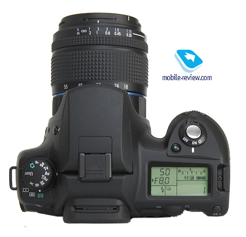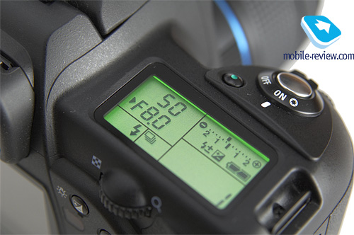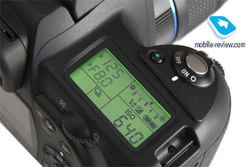 Здесь необходимо пояснение. Дело в том, что фокусировочное кольцо свободно вращается вручную, электропривод подхватывает управление им только в момент половинного нажатия на кнопку спуска (если это не отключено в меню). Вероятна ситуация, когда необходимо чуть подкорректировать фокусировку, которую предлагает автоматика. В этом случае достаточно провернуть кольцо фокуса и прижать клавишу AF (настроенную на отключение). В видоискателе загорится значок MF, как при ручной фокусировке. И можно быть уверенным, что при повторном нажатии на спуск ранее выбранные установки объектива не будут изменены. Управление стабилизатором. За активацию/деактивацию режима управления стабилизацией матрицы отвечает отдельный рычажок на корпусе. Он расположен под джойстиком. Прост в обращении. Главное не забывать отключать его, особенно если камера находится на штативе. Информационный дисплейИнформационный дисплей хоть и невелик, но позволяет нам видеть массу полезной информации. В первую очередь приятно, что экспопараметры обозначены большими крупными цифрами. Напротив значений есть специальные маркеры, которые сигнализируют о том, можно ли в данном режиме напрямую изменять значения выдержки и/или диафрагмы. Шкала экспокоррекции с хорошо читаемыми делениями. Отображение данных автоматически подстраивается в зависимости от выбранного шага (1/2 или 1/3 Ev). Как уже вскользь упоминалось, она имеет метки, которые активируются при работе в режиме автобрекетинга. Дисплей имеет встроенную яркую подсветку зелёного цвета. Она зажигается при нажатии на клавишу экспокоррекции, однако в меню настроек можно выбрать установку, при которой дополнительный свет включаться не будет.
