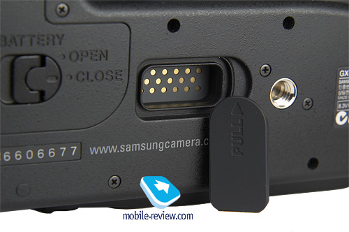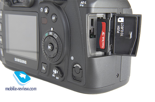 Похожий поворотный «ключ» и у дверцы слота карты памяти. Однако он находится не просто на некотором отдалении, но ещё и на другой грани относительно самой дверцы. Достаточно сделать поворот, и пружинный механизм автоматически откроет её. При этом камера обесточивается. Это позволяет избежать возможной потери данных. Карточка вставляется/извлекается традиционно. Что касается герметизирующего элемента, то он установлен на корпусе, а крышка имеет лишь соответствующий по форме выступ, который, прижимаясь к нему, исключает проникновение влаги и пыли внутрь фотоаппарата.