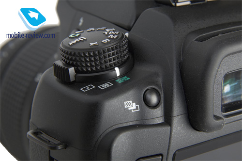 Селектор режимов работы камеры. Одного взгляда на главный управляющий диск достаточно, чтобы понять: эта камера рассчитана на людей, знающих толк в фотосъёмке. На нём нет ночных, «лесных», портретных и т.п. программных режимов. Единственный вариант, рассчитанный на слабо подготовленного фотографа, – зелёная зона. Остальные сектора являются той или иной вариацией автоэкспозиции. Здесь же присутствуют режимы ручной установки экспопараметров и BLUB (ручная длительная выдержка).