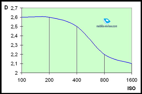 На графике наглядно видно, что основной спад наблюдается в промежутке 400-800 ISO. Максимальный результат держится до чувствительности в 200 единиц, это достаточно интересно.