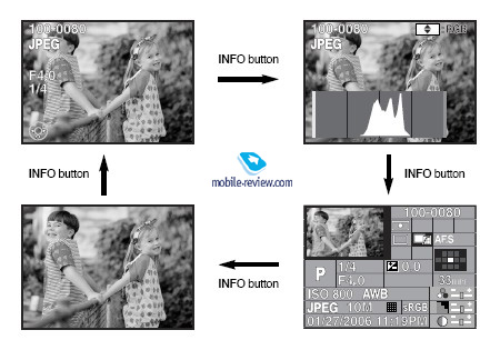 Остановимся более подробно на возможностях обыкновенного режима просмотра отснятого материала. Он предлагает нам четыре варианта отображения: полная информация, сокращённая информация (экспопараметры) с функцией поворота кадра, чистый кадр, гистограмма (по каналам или общая). Кроме этого, по каждому снимку можно вывести подробную съёмочную информацию. Удачная реализация. Исчерпывающие данные наглядно отображены.