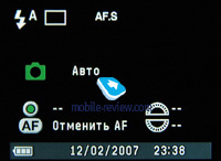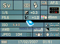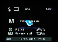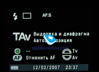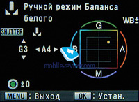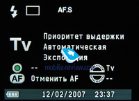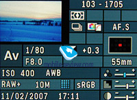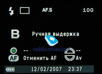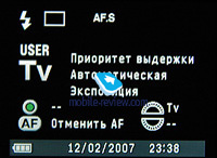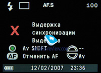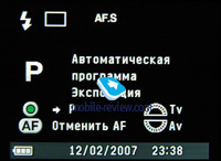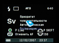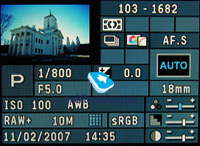 Значительное внимание уделено и оперативному управлению основными съёмочными параметрами. Очевидно, что перед разработчиками стояла задача обеспечить фотографа возможностью переключать их без отрыва от видоискателя (о нём чуть позже). И, надо сказать, с задачей этой они справились хорошо. Все необходимые для этого элементы управления присутствуют на корпусе. Джойстик. Центральная клавиша джойстика в стандартной версии прошивки (v1.00) инициирует отображение в видоискателе и на информационном дисплее дополнительной информации (в большинстве режимов значение ISO). В камерах с новой прошивкой (v1.10) ISO можно не только отображать, но и менять вращением управляющего колеса.
