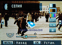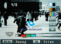 Всего доступно шесть эффектов: ч/б, сепия, колорирование, мягкая картинка, сжатие/растяжение, яркость. В русскоязычном переводе «сжатие/растяжение» почему-то перевели как контраст.