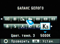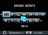 Для тех, кто сомневается в правильности выбранной цветовой температуры, есть функция «Проверить», которая активируется рычажком репетира диафрагмы. Камера делает тестовый кадр, по которому можно оценить точность настройки. При желании можно применить для него другие варианты ББ и выбрать из них лучший. Оценочный кадр на карту памяти не сохраняется, присутствует в камере виртуально до тех пор, пока включено питание.