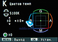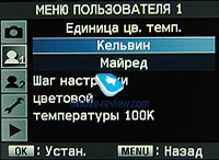 Если в меню включена опция «Тонкая настройка ББ», то возможно корректировать цветовую температуру для всех 8 предустановленных режимов. Помимо этого, можно выбрать шаг коррекции (100 Кельвин или 20 Майред).