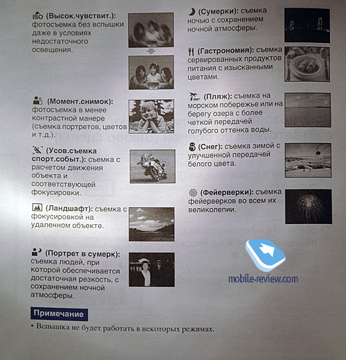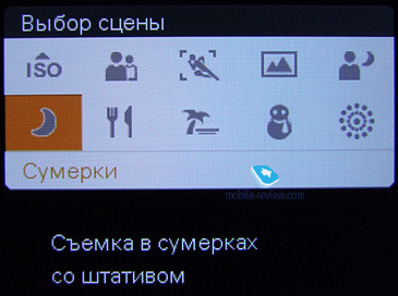 Режим «Выбор сцены» отличается от интеллектуального только тем, что здесь вы сами выбираете нужную сцену. Кроме того, внизу дисплея, помимо положения диафрагмы, также указывается время выдержки. ![]() ![]() Сцены:
