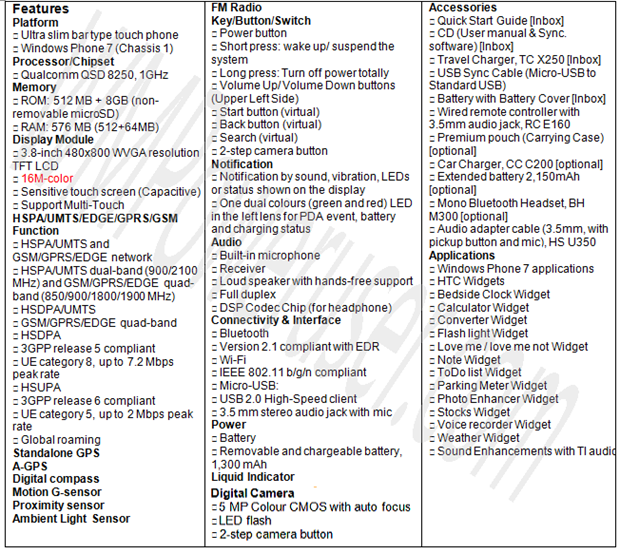 Под HTC Widgets надо понимать модификацию интерфейса HTC Sense для аппаратов с WP7. Нечто похожее уже демонстрировалось на видеозаписи с участием HTC 7 Trophy. Кроме того стало известно о наличии процессора Qualcomm Snapdragon с тактовой частотой 1 ГГц, беспроводных модулях Wi-Fi b/g/n и Bluetooth 2.1 +EDR, а также съемном аккумуляторе емкостью 1300 мАч и наличии навигационного модуля с поддержкой A-GPS. По всей видимости, смартфоны HTC с операционной системой WP7 ориентированы в большей степени на европейский рынок, поскольку в характеристиках HTC HD7, HTC 7 Mozart и HTC 7 Trophy указывается именно европейский стандарт UMTS 900/2100 МГц.