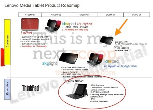 Кроме того, в роадмапе упоминается и 10-дюймовый планшет Lenovo ThinkPad, о котором мы писали в новостях буквально вчера. Другое название устройства - Think Slate и оно относится к категории бизнес-моделей. Устройство изображено вместе с "ноутбучной" док-станцией, а из характеристик упоминаются только основные - 10-дюймовый тачскрин 1280 x 800 точек, двухъядерный процессор и Android 3.0. Модель действительно выйдет в третьем квартале - согласно более ранним данным речь шла об июльском выпуске.