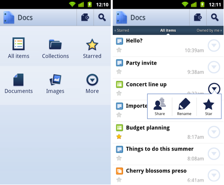 Компания Google наконец выпустила специальное приложение Google Docs для операционной системы Android. Теперь доступ к этому "облачному" сервису работы с документами с мобильного устройства стал более удобным. На рабочем столе даже можно разместить виджет Google Docs для быстрого доступа.