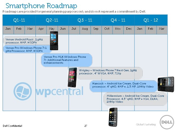 В сети были опубликован родмап, который демонстрирует намерения компании Dell расширить линейку своих смартфонов. Первым в ряду устройств данного производителя в текущем году станет модель с Windows Phone 7 – Dell Wrigley, который появится в конце июля или первой половине августа 2011 года. Отмечается, что он будет работать под управлением WP7 «нового поколения». Поскольку расшифровок не прилагается, то можно предположить, что имелась в виду обновленная версия данной ОС. Смартфон имеет 1 ГГц процессор, 4-дюймовый сенсорный экран с WVGA разрешением и 8-МП камеру с возможностью съемки видео 720р.