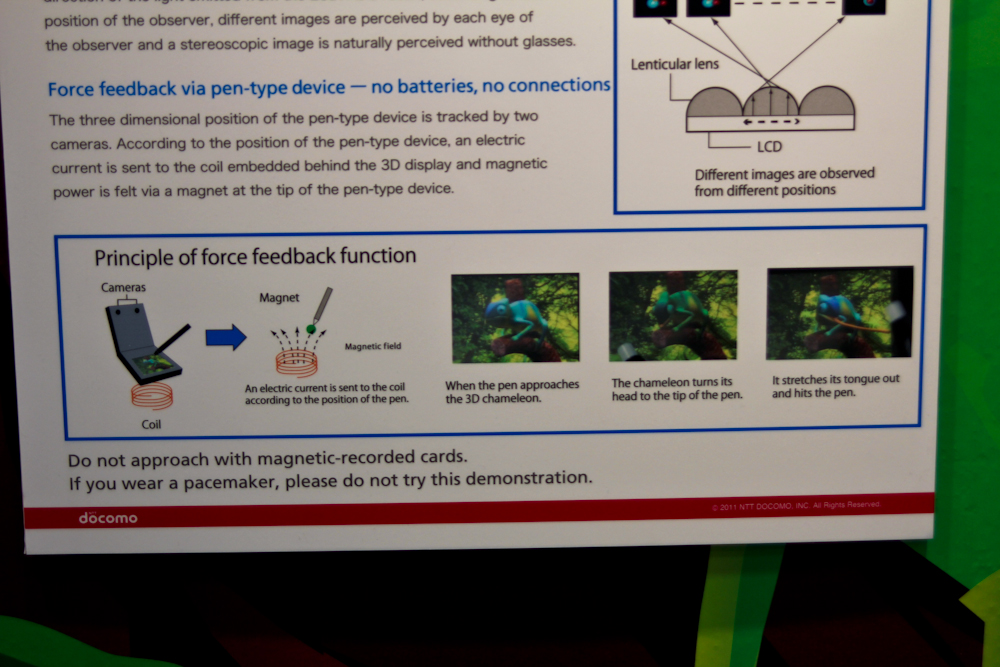 Японский оператор NTT DoCoMo на прошедшей в Барселоне выставке MWC 2011 продемонстрировал технологию Touchable 3D Display. Данная технология призвана обеспечить пользователей не только просмотром трехмерных изображений на экране, но и дать им ощущение того, что они прикасаются к трехмерному объекту. Для этого используется трехмерный дисплей не требующий специальных очков для просмотра и прилагающийся к набору стилус, который взаимодействует с создаваемым экраном магнитным полем, что вместе и дает «интерактивность» изображения.