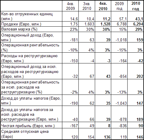 Консолидированные финансовые показатели компании Sony Ericsson за 4-й квартал и весь 2010 год, который для неё закончился 31 декабря 2010 года, выглядят следующим образом: