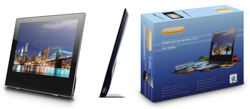 Digma PF-1005SL – тонкая цифровая фоторамка с большим цветным TFT-диcплеем размером 10,4-дюймовый и разрешением 800 x 600 точек. Сенсорные кнопки управления находятся на фронтальной поверхности устройства; также управлять меню возможно с помощью беспроводного инфракрасного пульта. Как и фоторамка PF-806SL, модель PF-1005SL поддерживает воспроизведение фотографий в формате JPEG, музыкальных файлов в формате MP3 и видеороликов в компьютерных кодировках Motion-JPEG / XviD / H.264. Для хранения информации доступна внутренняя память фоторамки 2 Гб и слоты для съемных накопителей: USB-флешек и карт памяти SD/MMC/MS. Можно смотреть отдельные снимки или запускайте слайд-шоу с музыкальным сопровождением.