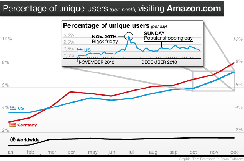 В компании проанализировали поведение пользователей браузера Opera Mini в США и Германии, чтобы на их примере проиллюстрировать данную тенденцию. Количество просмотренных страниц ресурса Amazon.com в этих странах к концу года оказалось вдвое больше, чем в первые месяцы 2010-го. Особенно отчётливо стремительный рост посещений обозначился в период наиболее активных распродаж, которые начались в «чёрную пятницу» (‘Black Friday’) 26 ноября и закончились «киберпонедельником» (‘Cyber Monday’) 29 ноября.