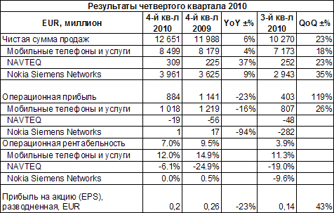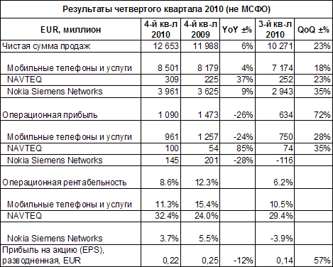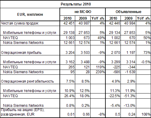 Финский производитель мобильных телефонов – компания Nokia отчиталась за прошедший для неё финансовый 2010 год и последний четвертый квартал, где её основные показатели выглядят следующим образом: