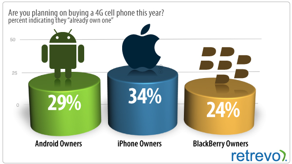 По данным опросов, 34% обладателей аппаратов от компании Apple почему-то уверены в том, что они имеют аппарат поддерживающий сети четвертого поколения. Вероятнее всего путаницу вносит то, что на рынке присутствует модель iPhone 4, и многие склонны полагать, что четверка означает не четвертую модель, а поддержку четвертого поколения мобильных сетей. Не способствует точности понимания и само определение 4G даваемое операторами. В то время как «настоящие» стандарты четвертого поколения — WiMAX и LTE действительно соответствуют 4G, есть и 3.5G, который иногда позиционируется как «четвертое поколение». В результате путаются не только обладатели iPhone 4. 24% владельцев BlackBerry также уверены в том, что их аппарат поддерживает 4G, при том, что среди моделей от RIM таковых не имеется. Несколько сложнее ситуация с Android-смартфонами. Часть этих аппаратов действительно поддерживают WiMAX и LTE сети, но таких намного меньше, чем уверенных в том, что поддержка 4G присутствует. Таких пользователей 29%, при том, что смартфонов с Android и 4G на рынке относительно немного, поскольку их продажи начались не так давно.