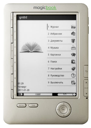 Компания Gmini объявила о выпуске в России в начале июне ридера MagicBook M61P. Это устройство с 6-дюймовым контрастным дисплеем E-Ink Pearl, способное отображать не только текст, но и картинки, а также воспроизводить музыку. При этом, поддерживается широкий спектр форматов файлов. Так, Gmini MagicBook M61P может показывать электронные книги с обложкой и разбиением на главы (файлы ePUB, FB2 и MOBI), а также распаковывать архивы ZIP. Музыка может воспроизводиться как в самостоятельном режиме, так и в фоне. Стоимость устройства составит 5990 рублей.