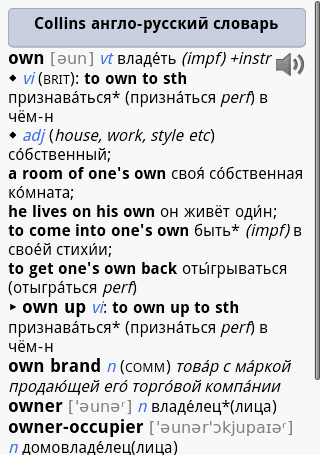 Электронные англо-русские словари Collins для пользователей ОС Android выходят в трех вариантах. Студентам и деловым людям, уверенно владеющим английским языком, а также тем, кто предпочитает чтение книг в оригинале, наиболее подойдет англо-русский словарь Collins Russian. Словарь содержит более 58 тыс. статей, подробные примеры употребления, а также лексику по тематикам: бизнес, компьютерные технологии, язык СМИ и современной литературы.