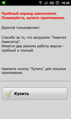 Для покупки лицензии на программу при запуске пробной версии, нажмите кнопку «Купить» после запуска программы, и выберите программу с необходимым комплектом карт. После чего вы будете переадресованы на страничку Android Market, где сможете найти подробное описание продукта, цену на него, и совершить покупку.
