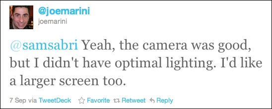 Кроме вышеприведенной записи, Джо Марини писал о неназываемом смартфоне от Nokia два раза. В ответ на вопрос как бы он оценил аппарат по 10-балльной шкале: В целом, я бы сказал 8. Цельное ощущение, хорошая камера, отзывчивый интерфейс и ряд приятных мелких штрихов в конструкции корпуса». Позднее добавив объяснение почему только 8 из 10: «Да, камера была хороша, но у меня не было подходящего света. И мне хотелось бы экран побольше».