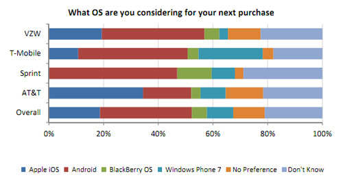В то же время сейчас доминирующими в США ОС остаются Android и iOS, между которыми и происходит наиболее напряженная борьба за покупателей. Между тем, 44% респондентов являющихся обладателями смартфонов или планирующих приобрести таковой в течение ближайшего полугода, рассматривают WP7 как вероятную ОС в своем устройстве. Но при этом 45% респондентов ответили, что они вообще ничего не знают о данной ОС, а 50% не выбирают ОС WP7, поскольку не обладают достаточной информацией о ней. Кроме того, значительная часть пользователей ориентируется не на саму операционную систему, а не экосистему. В результате лояльность пользователей Android и iOS обеспечивается тем, что люди вкладывают свои средства в покупку программ для данного типа устройств, а при переходе на другую операционную систему им придется начинать все заново.