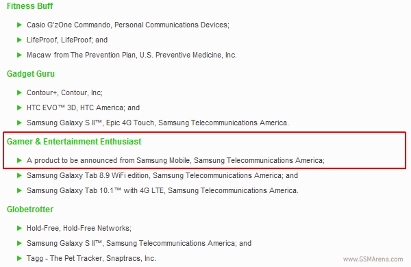 В списке же финалистов данное устройство от Samsung обозначено, как “продукт, который будет анонсирован от компании Samsung Mobile, Samsung Telecommunications America.” Попал он в раздел устройств для игры и отдыха, вместе с двумя планшетами от Samsung – Galaxy Tab 8.9 Wi-Fi и Galaxy Tab 10.1 с модулем 4G LTE. Не исключено, что этот «продукт» является смартфоном Samsung Nexus Prime, который по предварительной информации будет демонстрировать потенциал нового поколения платформы Android от Google и, соответственно, обладать высокой производительностью. Также неизвестное устройство присутствует и в категории Shutterbug, но в этом случае не указан и производитель, поэтому сказать что это и кем будет представлено нельзя даже приблизительно.