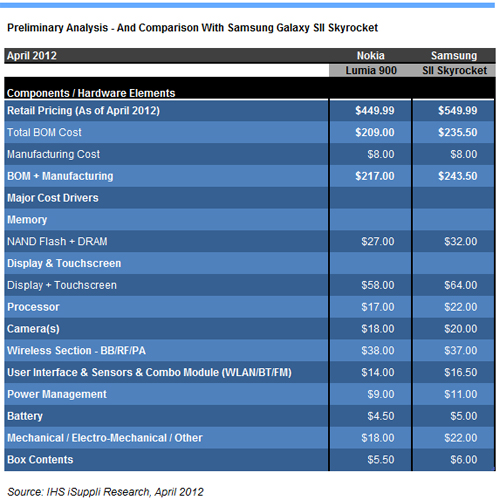 Ресурс iSuppli опубликовал предварительную информацию о стоимости комплектующих одного смартфона Nokia Lumia 900. Аппарат оказался довольно дорогим в изготовлении — 217 долларов, но при этом его цена у оператора AT&T без контракта составляет 450 долларов, а с контрактом - $100. Собственно комплектующие, которые используются для изготовления аппарата обходятся Nokia в $209, а еще 8 долларов — это стоимость сборки одного смартфона. Стоит отметить, что в названную сумму не входит стоимость доставки материалов производителю, собранного смартфона до места продажи, а также расходы на маркетинг.