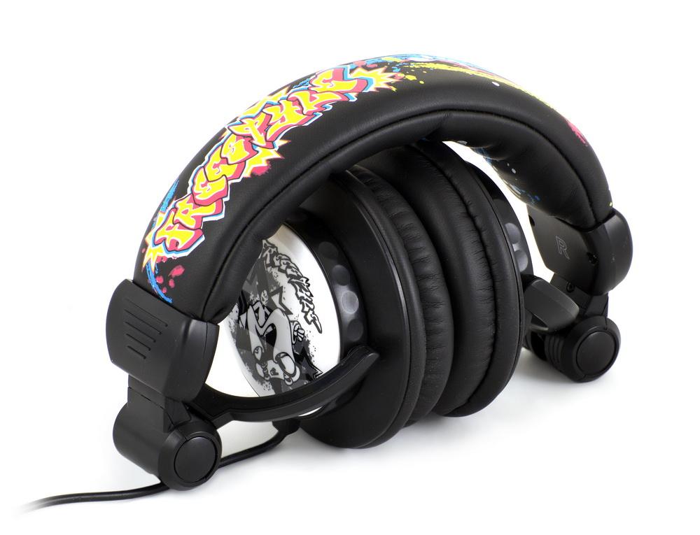 Это наушники с закрытым акустическим оформлением. Внешняя сторона чашечек у Freestyle пластиковая, с глянцевым дизайном - «граффити», а вот оголовье такое же мягкое, как и у предыдущих моделей. Эргономика также на высоте – оголовье плотно, но не сильно прижимает амбушюры к ушам. Из-за большего диаметра динамиков, который равен аж 58мм, чашечки заметно больше, чем у Toxic MKII. Однако, они складываются внутрь оголовья, что делает размер Freestyle в сложенном состоянии сопоставимым с Toxic MKII.