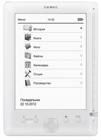 4 ГБ встроенной памяти позволят загрузить множество электронных книг. Пользователи также могут воспользоваться картами памяти формата microSD/SDHC объемом до 32 ГБ. Толщина ридера составляет 10 мм, для управления teXet TB-406 предусмотрен блок кнопок выбора пунктов меню или файлов, расположенный справа от дисплея, классические клавиши перелистывания страниц, "Домой", "Меню" и "Назад", а также центральный четырехпозиционный джойстик. Модель teXet TB-406 4 ГБ эксклюзивно представлена в магазинах "Евросеть" по цене 2999 рублей.