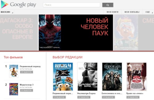 Кроме того, в Google Play имеется множество фильмов. Онлайн-магазин предлагает напрокат разные киноленты: новые релизы ("Новый Человек-паук", "Прометей", "Белоснежка и охотник", "Диктатор") и российские фильмы ("2 дня", "Бой с тенью", "8 первых свиданий"). Среди партнеров - кинокомпании с мировым именем (NBC Universal, Paramount Pictures, Sony Pictures Home Entertainment, Twentieth Century Fox) и российские студии, например, "X-Media Digital" и "Централ Партнершип".