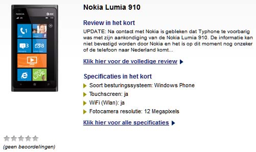 Компания Nokai пока официально не анонсировала смартфон Lumia 910, но один из онлайн магазинов уже выставил ее в своем каталоге. Аппарат внешне и по характеристикам весьма похож на предназначенный для американского рынка Nokia Lumia 900, от которого отличается главным образом отсутствием поддержки сетей стандарта LTE и наличием модуля камеры с 12-МП матрицей. Такой фотографический модуль напоминает о том, что Lumia 910 вполне может быть фотоориентированным преемником смартфона Nokia N8. На сайте продавца нет сведений о том, когда и по какой цене аппарат поступит в продажу, однако сам факт его появления говорит о том, что это произойдет весьма скоро.