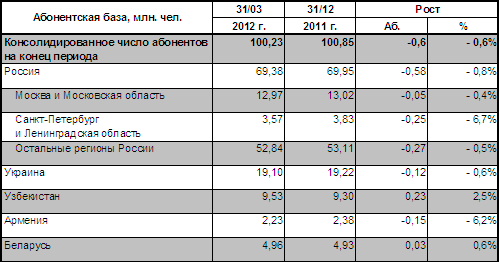 Оператор мобильной связи МТС сообщил, что его консолидированная абонентская база по состоянию на 31 марта 2012 года составила 100,23 миллиона пользователей.