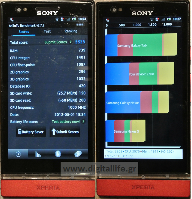 Результат Sony Xperia P оказался несколько хуже в сравнении с аппаратами Samsung в тесте AnTuTu, в котором его показатели оказались 5325б в то время как Galaxy S II показал 6249, а Galaxy Note – 6495. Кроме процессора с тактовой частотой 1 Ггц, причиной отставания могут считаться пререлизный статус и операционная система Android в версии Gingerbread. Гораздо хуже аппарат от Sony выглядел в тесте NenaMark 2, который показывает производительность графического ускорителя. Если модели Samsung, включая Galaxy Note число пикселей на экране которого почти вдвое превосходит Xperia P, показали результат не менее 33,9 fps, то смартфон от Sony дал только 29,2 fps. Это может означать, что либо в Sony намерено снизили тактовую частоту Mali-400MP, либо аппарат испытывает каие-то проблемы с ПО.