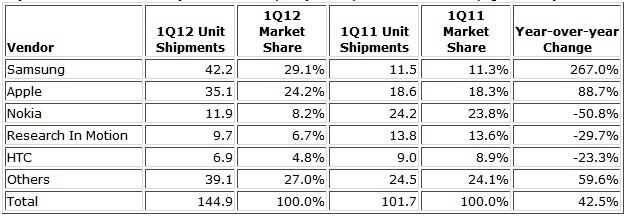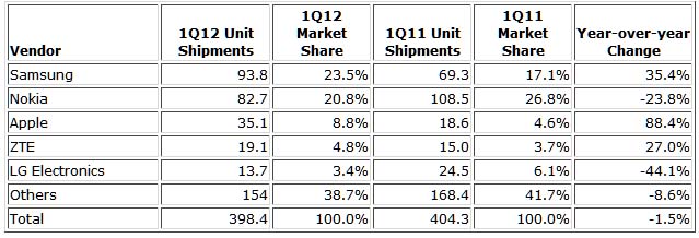 Компания IDC опубликовала данные по своей статистике, демонстрирующей тенденции развития рынка мобильных телефонов. Главным событием последнего квартала стала безусловно потеря лидерства компанией Nokia, на первую строчку рейтинга вышла корейская компания Samsung. В то же время рынок несколько сократился: если в первом квартале 2011 года общее число продаж составило 404,3 миллиона устройств, то в 2012 году только 398,4 миллиона — падение на 1,5%. При этом, захват рынка Samsung обусловлен его успехами в секторе смартфонов, продажи которых растут. За прошедший год продажи смартфонов возросли на 42,5%. В первом квартале 2011 года таких аппаратов было поставлено 101,7 миллиона, а в 2012 году уже 144,9 миллиона. Samsung и здесь захватил лидерство, поставив смартфонов больше, чем Apple. Создавшая и долгое время лидировавшая на этом рынке компания Nokia сильно отстала от обоих производителей: