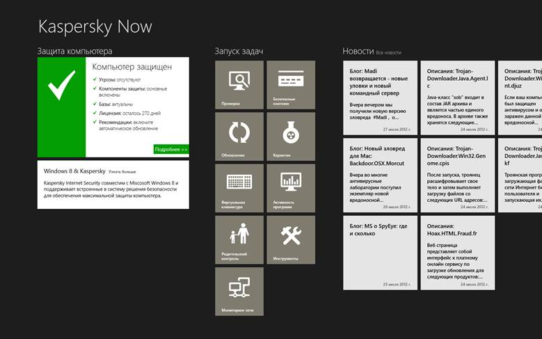 Чтобы обеспечить пользователей актуальной информацией о состоянии безопасности их компьютера под управлением Windows 8, «Лаборатория Касперского» разработала новое приложение Kaspersky Now. Оно предназначено специально для нового интерфейса операционной системы. Kaspersky Now можно загрузить бесплатно из онлайн-магазина Microsoft Windows Store. Приложение работает с последними версиями решений «Лаборатории Касперского» для домашних пользователей – Kaspersky Internet Security и Антивирусом Касперского.