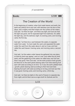 Электронная книга Digma s605t предполагает управление с помощью центрального джойстика и механических кнопок на фронтальной панели. Для перелистывания страниц доступны боковые кнопки, обеспечивающие переход к предыдущей / следующей странице. Главный экран электронной книги визуально разбит на 4 блока: "Недавно открытые книги", "Аудио плеер", "Календарь" и "Список основных приложений".