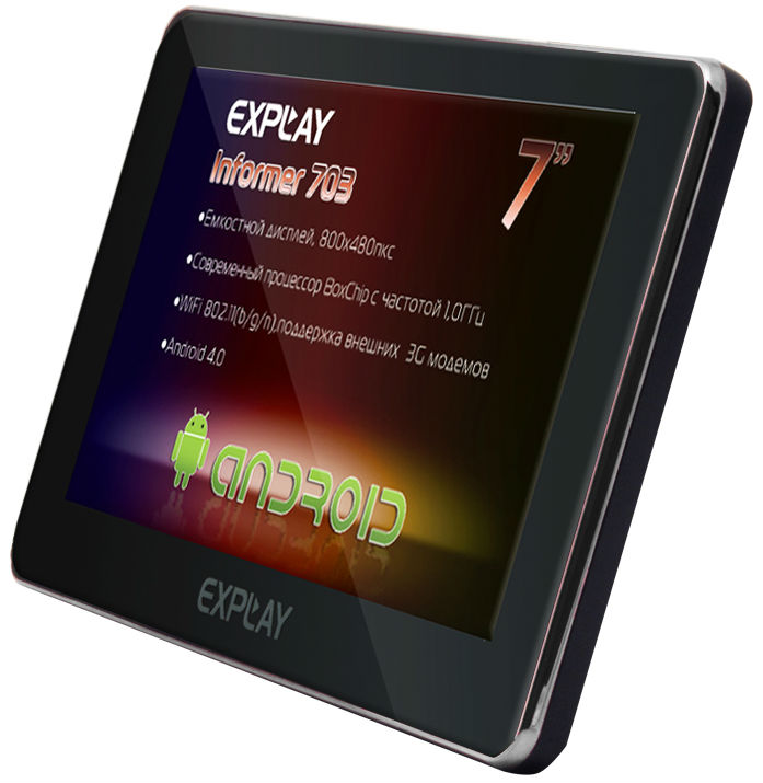 Замыкает анонс планшет со встроенной поддержкой 3G сетей – Explay 708 3G, выполненный в тонком корпусе и оснащенный 7-дюймовым экраном разрешением 800х480. Informer 708 3G работает под управлением операционной системы Android 4.0 Ice Cream Sandwich, оснащается процессором RockChip A10, 512 Мб ОЗУ и 4 Гб встроенной памяти, расширяемой microSD картами памяти (до 32 Гб). Из коммуникационных возможностей указывается на наличие разъемом mini-HDMI и USB 2.0 (HOST) с возможностью подключения внешних устройств, таких как флеш-накопители, мышь, клавиатура.