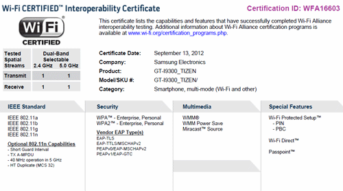 Организация Wi-Fi Alliance сертифицировала модель на основе операционной системы Tizen. Правда, о ней практически ничего не известно - в документации упоминается лишь название GT-I9300 TIZEN и поддержка беспроводного стандарта Wi-Fi с технологиями Wi-Fi Direct и Miracast. Пока не ясно, как выглядит устройство и каковы его характеристики, но индекс смартфона (GT-I9300) такой же, как у флагмана Samsung Galaxy S III.