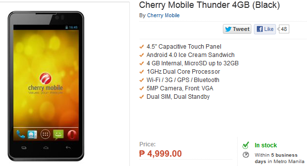 Филиппинская компания Cherry Mobile известна тем, что некоторое время назад она представила 2-ядерный Android смартфон с 4-дюймовым экраном за 100 долларов, а 5-дюймовый телефон-планшет в ее исполнении обошелся бы в 110 долларов. Теперь она представила модель Cherry Mobile Thunder, которая также отличается крайне низкой ценой, при вполне средних характеристиках. Аппарат обладает 4,5-дюймовым сенсорным экраном с разрешением 480 на 854 точки с плотностью 218 пикселей на дюйм, двухъядерный процессор Mediatek с тактовой частотой 1 ГГц, 512 МБ оперативной памяти и 4 ГБ встроенной. Последняя может быть увеличена с помощью карт памяти емкостью до 32 ГБ. Имеется и довольно стандартный набор камер — 5 МП основная и фронтальная VGA.