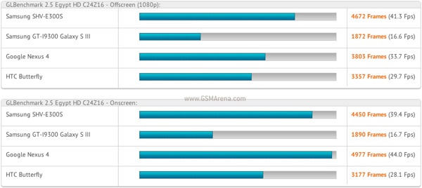 На сайте теста GLBenchmark появилась информация, которая может относиться к будущему флагману компании Samsung. Речь идет о публикации онлайн результатов тестирования устройств на сайте. Среди которых было обнаружено некое устройство Samsung SHV-E300S, производительность которого на уровне Google Nexus 4 и превосходит Samsung Galaxy S III. Такое наименование может указывать на то, что перед нами сведения о производительности корейского варианта смартфона, поскольку аппарат построен на базе процессора Qualcomm MSM8960, в то время как во флагманском аппарате будет процессор Exynos.