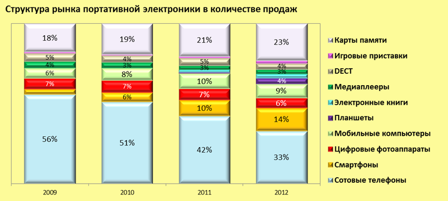 По оценке компании «Евросеть», рынок портативной электроники в 2012 году продолжил свое развитие, показав прирост в 16,7% в количественном и 20,5% - в денежном выражении. Таким образом, на рынке РФ за 2012 год было реализовано 88,6 млн. устройств, выручка от которых составила 484,8 млрд. руб. В количественном выражении, несмотря на значительное сокращение продаж, максимальную долю продолжает занимать сегмент простых сотовых телефонов. На втором месте – рынок карт памяти, который увеличил долю в количестве продаж на два процентных пункта (пп). Рынок смартфонов вышел на третью позицию, заняв 14% от общего количества продаж устройств на рынке, оттеснив мобильные компьютеры, которые потеряли 1 пп по сравнению с прошлым годом. Рынок в денежном выражении прирос на 20,5% к прошлому году и составил 484,8 млрд. руб. Наибольший прирост показал сегмент планшетов: + 256,7% к прошлому году. Максимальный прирост к 2011 году показал сегмент планшетов (+366% в количестве). Больше, чем на 100% в количестве приросли рынки электронных книг и игровых приставок. Выше среднего по рынку показали прирост смартфоны (+69% в количестве и +60% в выручке), рынок карт памяти (+31% в количестве и +23% в выручке) и медиаплееры (только в количестве: +25%).