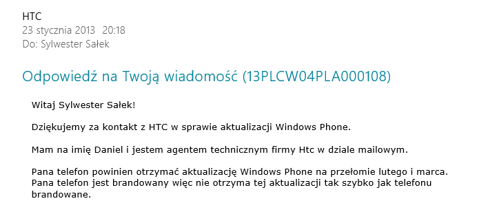 Со стороны польского представительства компании HTC поступило интересное сообщение. Смартфоны на базе ОС Windows Phone первого поколения будут обновляться. По крайней мере, один из первых аппаратов с данной ОС, HTC 7 Mozart получит обновление до версии 7.8. Точные сроки выхода этого обновления ПО пока не известны, но ориентировочный период — конец февраля или начало марта. Это вероятно медленнее, чем для более новых смартфонов, однако, сам факт такой возможности имеет место быть.
